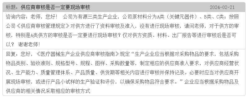 根據(jù)國(guó)家藥監(jiān)局食品藥品審核查驗(yàn)中心的答復(fù),《醫(yī)療器械生產(chǎn)企業(yè)供應(yīng)商審核指南》規(guī)定“生產(chǎn)企業(yè)應(yīng)當(dāng)根據(jù)對(duì)采購(gòu)物品的要求,包括采購(gòu)物品類別、驗(yàn)收準(zhǔn)則、規(guī)格型號(hào)、規(guī)程、圖樣、采購(gòu)數(shù)量等,制定相應(yīng)的供應(yīng)商準(zhǔn)入要求,對(duì)供應(yīng)商經(jīng)營(yíng)狀況、生產(chǎn)能力、質(zhì)量管理體系、產(chǎn)品質(zhì)量、供貨期等相關(guān)內(nèi)容進(jìn)行審核并保持記錄。必要時(shí)應(yīng)當(dāng)對(duì)供應(yīng)商開展現(xiàn)場(chǎng)審核,或進(jìn)行產(chǎn)品小試樣的生產(chǎn)驗(yàn)證和評(píng)價(jià),以確保采購(gòu)物品符合要求?!逼髽I(yè)應(yīng)當(dāng)根據(jù)采購(gòu)物品及供應(yīng)商的相關(guān)情況采取相應(yīng)的審核方式。