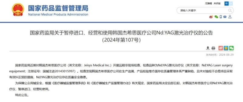 為保障公眾用械安全,根據(jù)《醫(yī)療器械監(jiān)督管理條例》和《醫(yī)療器械生產(chǎn)監(jiān)督管理辦法》有關(guān)規(guī)定,國家藥監(jiān)局決定自即日起,對韓國杰希思醫(yī)療公司Nd:YAG激光治療儀,暫停進(jìn)口、經(jīng)營和使用。