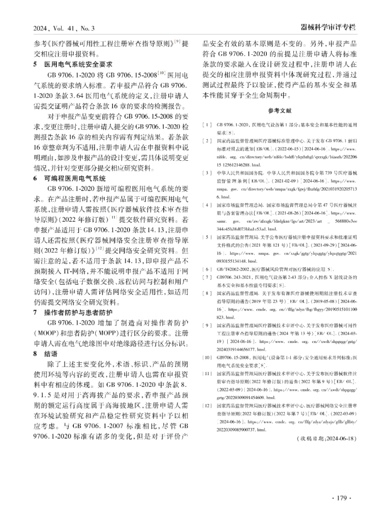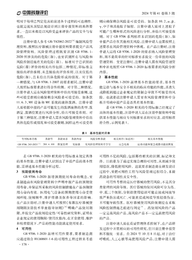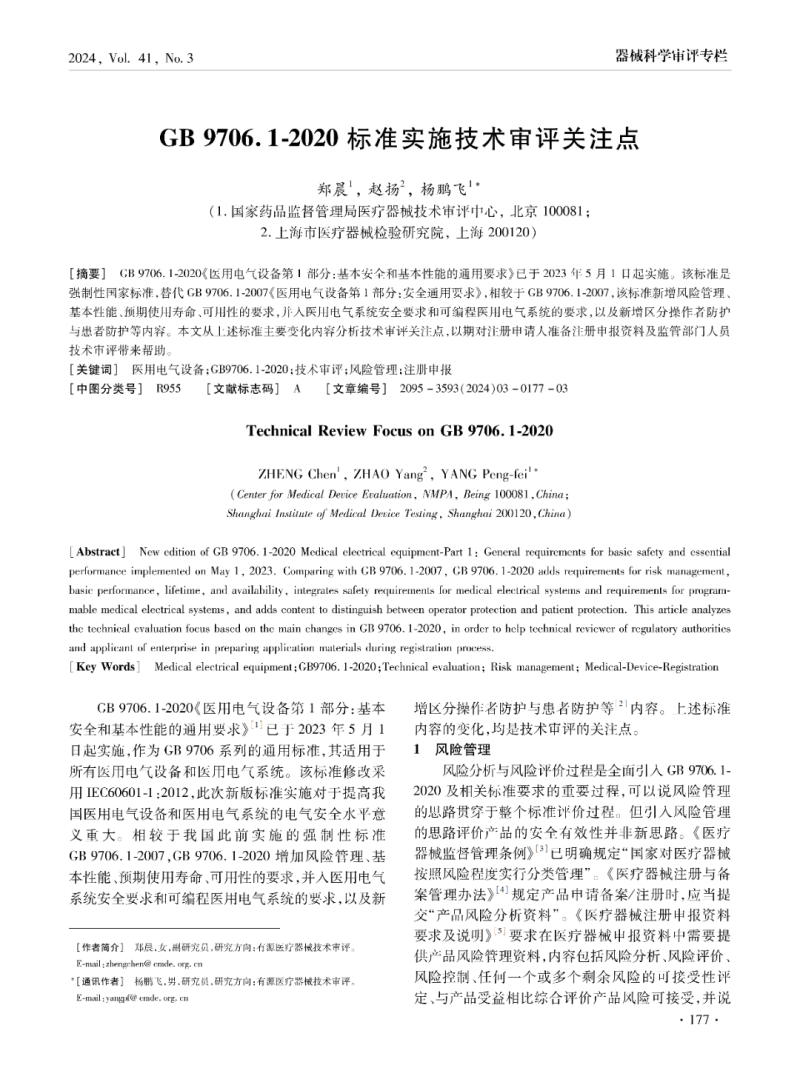 GB 9706.1-2020《醫(yī)用電氣設(shè)備第1 部分:基本安全和基本性能的通用要求》已于2023年5月1日起實施。該標(biāo)準(zhǔn)是強制性國家標(biāo)準(zhǔn),替代GB 9706.1-2007《醫(yī)用電氣設(shè)備第1部分:安全通用要求》,相較于GB 9706.1-2007,該標(biāo)準(zhǔn)新增風(fēng)險管理、基本性能、預(yù)期使用壽命、可用性的要求,并入醫(yī)用電氣系統(tǒng)安全要求和可編程醫(yī)用電氣系統(tǒng)的要求,以及新增區(qū)分操作者防護(hù)與患者防護(hù)等內(nèi)容。本文從上述標(biāo)準(zhǔn)主要變化內(nèi)容分析技術(shù)審評關(guān)注點,以期對注冊申請人準(zhǔn)備注冊申報資料及監(jiān)管部門人員技術(shù)審評帶來幫助。