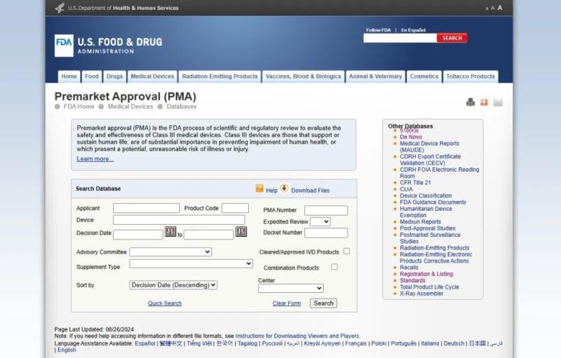 該數(shù)據(jù)庫包含所有通過PMA路徑在美國(guó)上市的高風(fēng)險(xiǎn)醫(yī)療器械的信息。