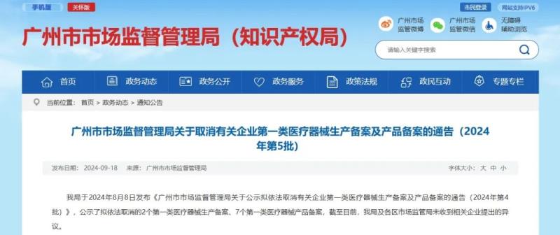 9月18日,廣州市市場監(jiān)督管理局官網(wǎng)發(fā)布一則取消第一類醫(yī)療器械生產(chǎn)備案及產(chǎn)品備案的通告,通告指出,因廣東嘉雅醫(yī)療器械有限公司、廣州市歐之康醫(yī)療器械有限公司未在備案場所經(jīng)營且無法聯(lián)系,在公示期間該局及各區(qū)市場監(jiān)管局未收到相關(guān)企業(yè)提出的異議。
