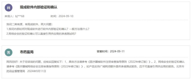 根據(jù)北京市藥監(jiān)局的答復(fù),軟件驗(yàn)證和確認(rèn)具體方法可參考《醫(yī)療器械軟件注冊(cè)審查指導(dǎo)原則(2022年修訂版)》;網(wǎng)絡(luò)安全的驗(yàn)證和確認(rèn)則可參考《醫(yī)療器械網(wǎng)絡(luò)安全注冊(cè)審查指導(dǎo)原則(2022年修訂版)》,如產(chǎn)品支持廣域網(wǎng),需額外提供滲透測(cè)試報(bào)告,且不可直接引用供應(yīng)商的報(bào)告。
