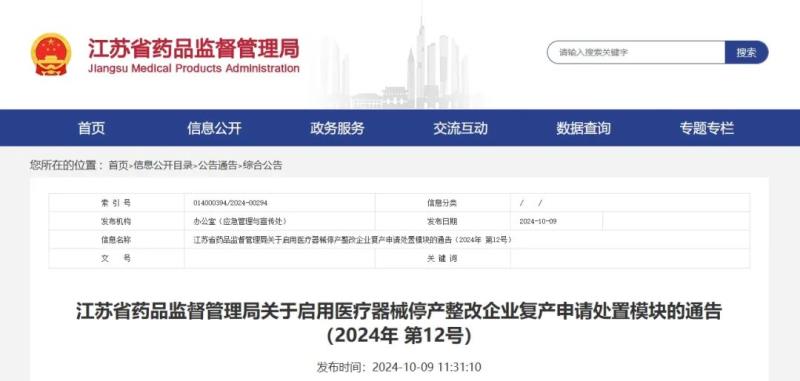 近日,江蘇省藥監(jiān)局發(fā)布《關(guān)于啟用醫(yī)療器械停產(chǎn)整改企業(yè)復(fù)產(chǎn)申請?zhí)幹媚K的通告》,其中提到,自2024年10月15日起,江蘇省藥品監(jiān)督管理局決定啟用醫(yī)療器械停產(chǎn)整改企業(yè)復(fù)產(chǎn)申請?zhí)幹媚K。具體通告內(nèi)容如下: