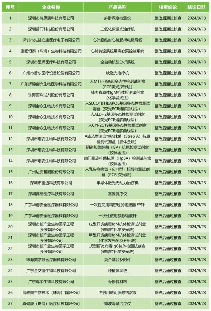 10月17日,廣東省藥監(jiān)局官網(wǎng)公布2024年9月醫(yī)療器械注冊質(zhì)量管理體系核查結(jié)果,包括海雅美生物技術(shù)(珠海)有限公司的注射用透明質(zhì)酸鈉溶液、深圳普門科技股份有限公司的二氧化碳激光治療機(jī)、廣州市普東醫(yī)療設(shè)備股份有限公司的鈥激光治療機(jī)等共計(jì)27款產(chǎn)品,核查結(jié)論均為“整改后通過核查”。具體明細(xì)見下方表格: