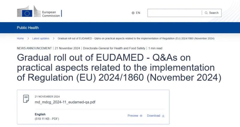近日,歐盟發(fā)布Gradual roll out of EUDAMED - Q&As on practical aspects related to the implementation of Regulation (EU) 2024/1860,該文件旨在促進(jìn)歐洲議會(huì)和理事會(huì)2024年6月13日(EU)2024/1860號(hào)法規(guī)的實(shí)施,該法規(guī)修訂了(EU)2017/745(MDR)和(EU)2017/746(IVDR)法規(guī),涉及Eudamed的逐步推出、供應(yīng)中斷時(shí)的通知義務(wù)以及某些體外診斷醫(yī)療器械的過渡條款。