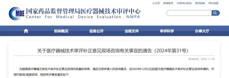 近日,國家藥監(jiān)局器審中心發(fā)布《關(guān)于醫(yī)療器械技術(shù)審評補(bǔ)正意見現(xiàn)場咨詢有關(guān)事宜的通告》,其中提到,自2024年12月2日起提交醫(yī)療器械技術(shù)審評補(bǔ)正意見咨詢申請的,可預(yù)約現(xiàn)場/視頻咨詢,有關(guān)事宜通告如下: