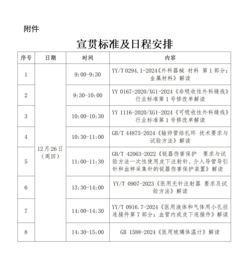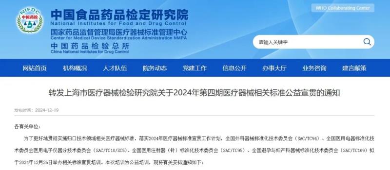 近日,國家藥監(jiān)局醫(yī)療器械標(biāo)準(zhǔn)管理中心轉(zhuǎn)發(fā)了《上海市醫(yī)療器械檢驗(yàn)研究院關(guān)于2024年第四期醫(yī)療器械相關(guān)標(biāo)準(zhǔn)公益宣貫的通知》,其中提到,全國外科器械標(biāo)準(zhǔn)化技術(shù)委員會(huì)(SAC/TC94)、全國醫(yī)用電器標(biāo)準(zhǔn)化技術(shù)委員會(huì)醫(yī)用電子儀器分技術(shù)委員會(huì)(SAC/TC10/SC5)、全國醫(yī)用注射器(針)標(biāo)準(zhǔn)化技術(shù)委員會(huì)(SAC/TC95)、全國避孕與婦產(chǎn)科器械標(biāo)準(zhǔn)化技術(shù)委員會(huì)(SAC/TC169)擬于2024年12月26日舉辦相關(guān)標(biāo)準(zhǔn)宣貫培訓(xùn),培訓(xùn)內(nèi)容為YY/T 0907-2023《醫(yī)用無針注射器要求及驗(yàn)方法》等8項(xiàng)標(biāo)準(zhǔn)解讀,具體如下: