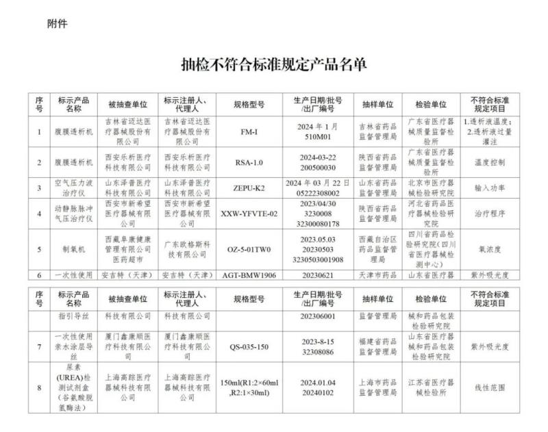 (一)腹膜透析設(shè)備2臺(tái):分別為吉林省邁達(dá)醫(yī)療器械股份有限公司生產(chǎn),涉及透析液溫度、透析液過(guò)量灌注不符合標(biāo)準(zhǔn)規(guī)定;西安樂(lè)析醫(yī)療科技有限公司生產(chǎn),涉及溫度控制不符合標(biāo)準(zhǔn)規(guī)定。 (二)肢體加壓理療設(shè)備2臺(tái):分別為山東澤普醫(yī)療科技有限公司生產(chǎn),涉及輸入功率不符合標(biāo)準(zhǔn)規(guī)定;西安市新希望醫(yī)療器械有限公司生產(chǎn),涉及治療程序不符合標(biāo)準(zhǔn)規(guī)定。 (三)醫(yī)用分子篩制氧機(jī)1臺(tái):廣東歐格斯科技有限公司生產(chǎn),涉及氧濃度不符合標(biāo)準(zhǔn)規(guī)定。 (四)導(dǎo)絲2批:分別為安吉特(天津)科技有限公司、廈門鑫康順醫(yī)療科技有限公司生產(chǎn),涉及紫外吸光度不符合標(biāo)準(zhǔn)規(guī)定。 (五)尿素測(cè)定試劑盒1批:上海高蹤醫(yī)療器械科技有限公司生產(chǎn),涉及線性范圍不符合標(biāo)準(zhǔn)規(guī)定。