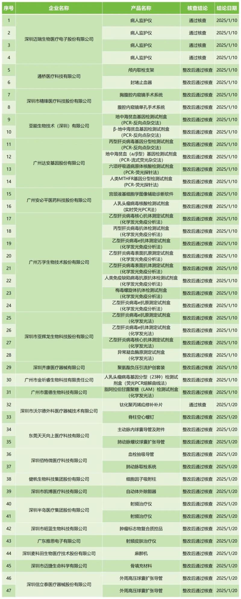 2月12日,廣東省藥監(jiān)局官網(wǎng)公布2025年1月醫(yī)療器械注冊(cè)質(zhì)量管理體系核查結(jié)果,包括深圳邁瑞生物醫(yī)療電子股份有限公司的四款病人監(jiān)護(hù)儀、深圳半島醫(yī)療集團(tuán)股份有限公司的兩款射頻治療儀、廣東雅思電子有限公司的射頻皮膚治療儀等共計(jì)47款產(chǎn)品,其中有五款產(chǎn)品核查結(jié)論為“通過(guò)核查”,其余均為“整改后通過(guò)核查”。具體明細(xì)見(jiàn)下方表格: