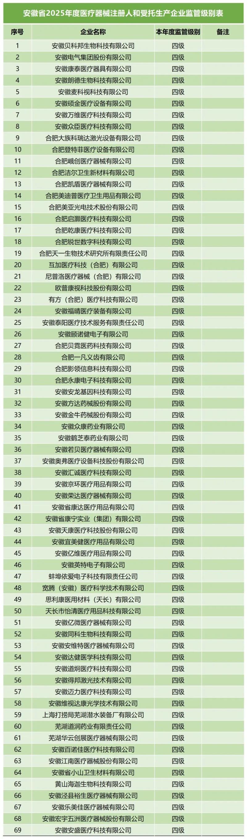 日前,安徽省藥監(jiān)局公布了2025年度醫(yī)療器械注冊人和受托生產企業(yè)監(jiān)管級別企業(yè)名單,我們通過查看附件發(fā)現(xiàn),共有536家企業(yè),其中有69家企業(yè)為四級監(jiān)管,52家企業(yè)為三級監(jiān)管,其余415家企業(yè)為二級監(jiān)管。我們將四級監(jiān)管企業(yè)名單摘錄如下:
