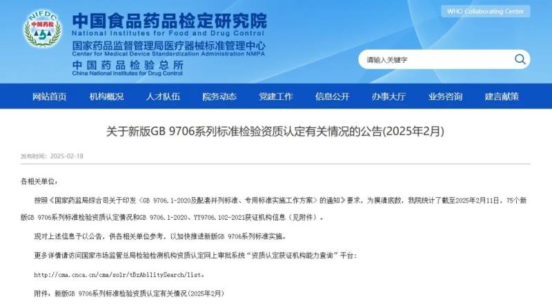 近日,中檢院官網(wǎng)公布了截至2025年2月11日,75個新版GB 9706系列標(biāo)準(zhǔn)檢驗資質(zhì)認(rèn)定情況和GB 9706.1-2020、YY 9706.102-2021獲證機(jī)構(gòu)信息。