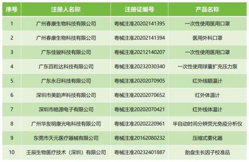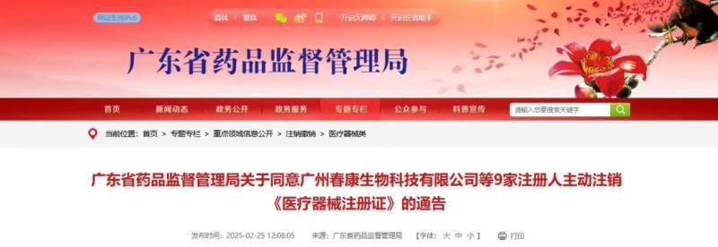2月25日,廣東藥監(jiān)局發(fā)布通告稱,廣州春康生物科技有限公司、廣東佳駿科技有限公司等9家注冊人向廣東省藥品監(jiān)督管理局主動(dòng)提出注銷產(chǎn)品注冊證的申請。根據(jù)《醫(yī)療器械監(jiān)督管理?xiàng)l例》的規(guī)定,現(xiàn)對該9家注冊人持有的10張《醫(yī)療器械注冊證》依法予以注銷,主要包括醫(yī)用口罩、紅外體溫計(jì)、壓縮式霧化器等產(chǎn)品,具體明細(xì)如下: