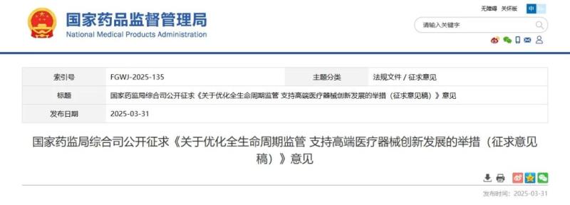 3月31日,國家藥監(jiān)局發(fā)布《關(guān)于優(yōu)化全生命周期監(jiān)管支持高端醫(yī)療器械創(chuàng)新發(fā)展的舉措(征求意見稿)》(以下簡稱《舉措》),從多方面提出支持舉措,全力推動高端醫(yī)療器械的創(chuàng)新與發(fā)展,現(xiàn)向社會公開征求意見。