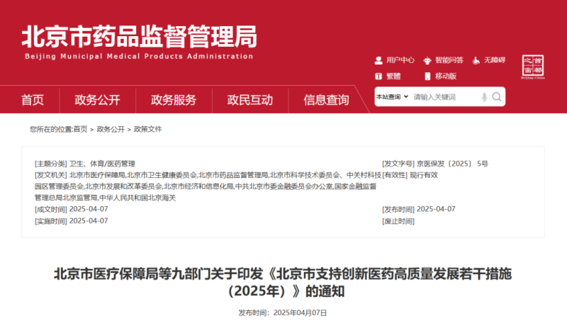 4月7日,北京市醫(yī)療保障局、北京市藥監(jiān)局等九部門發(fā)布《北京市支持創(chuàng)新醫(yī)藥高質(zhì)量發(fā)展若干措施(2025年)》(以下簡稱《措施》),《措施》共分為八個(gè)部分,包括:持續(xù)促進(jìn)臨床試驗(yàn)提質(zhì)增效(5條)、不斷提升審評審批效能(6條)、持續(xù)擴(kuò)大創(chuàng)新醫(yī)藥生產(chǎn)流通(6條)、持續(xù)推動(dòng)創(chuàng)新醫(yī)藥臨床使用(5條)、人工智能賦能醫(yī)藥創(chuàng)新發(fā)展(2條)、加強(qiáng)創(chuàng)新醫(yī)藥投融資支持(2條)、優(yōu)化創(chuàng)新醫(yī)藥產(chǎn)業(yè)布局(2條)和保障措施(4條)。