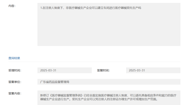 根據(jù)廣東省藥監(jiān)局的答復,新修訂《醫(yī)療器械監(jiān)督管理條例》已經(jīng)全面實施醫(yī)療器械注冊人制度,可以委托具備相應條件和能力的醫(yī)療器械生產(chǎn)企業(yè)進行生產(chǎn)。受托生產(chǎn)企業(yè)可以憑注冊人的注冊證辦理生產(chǎn)許可或增加生產(chǎn)范圍。