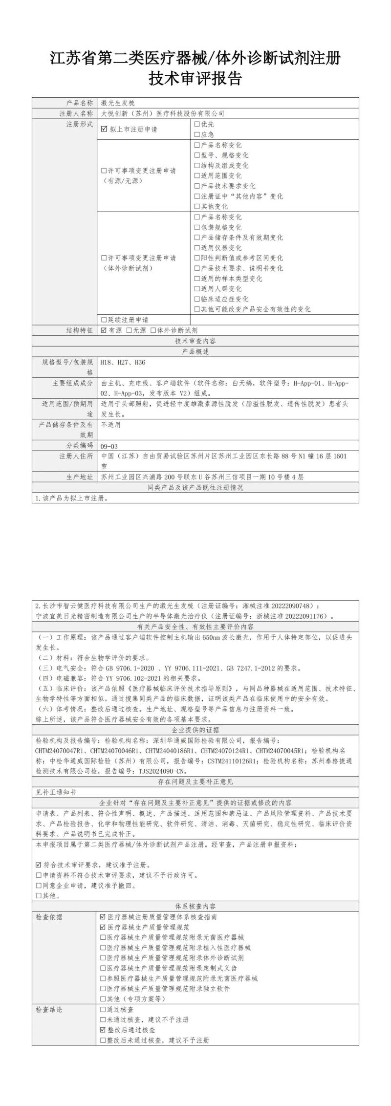 近日,江蘇省藥監(jiān)局公布了2025年3月批準注冊的肺功能儀、睡眠呼吸初篩儀、全自動艾灸儀、重組膠原蛋白液體敷料、激光生發(fā)儀、激光生發(fā)梳、重組貽貝黏蛋白液體敷料、微波理療儀、醫(yī)用分子篩制氧機等139個醫(yī)療器械產(chǎn)品目錄,同時隨附了所有產(chǎn)品的技術審評報告,我們其中“激光生發(fā)梳”[預期用途:適用于頭部照射,促進輕中度雄激素源性脫發(fā)(脂溢性脫發(fā)、遺傳性脫發(fā))患者頭發(fā)生長]的技術審評報告以圖片形式轉(zhuǎn)載如下: