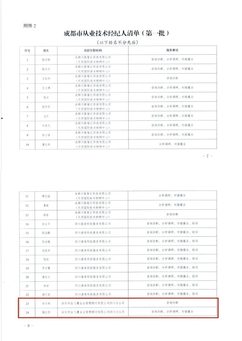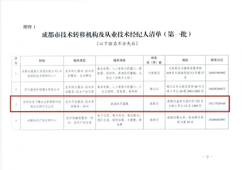 5月7日,成都市技術(shù)轉(zhuǎn)移聯(lián)盟通過其官方公眾號(hào)正式公布了2025年第一季度成都市技術(shù)轉(zhuǎn)移機(jī)構(gòu)及從業(yè)技術(shù)經(jīng)紀(jì)人名單。經(jīng)嚴(yán)格評(píng)審,深圳市金飛鷹企業(yè)管理顧問有限公司四川分公司成功入選20家技術(shù)轉(zhuǎn)移機(jī)構(gòu)之一,服務(wù)領(lǐng)域?yàn)?span textstyle="" style="font-weight: bold;">高端醫(yī)療器械。同時(shí),金飛鷹集團(tuán)創(chuàng)始人車號(hào)爽先生及四川分公司總經(jīng)理陶亞琴女士憑借其豐富的行業(yè)經(jīng)驗(yàn)和專業(yè)能力,則分別當(dāng)選為從業(yè)技術(shù)經(jīng)紀(jì)人,為聯(lián)盟企業(yè)提供咨詢?cè)\斷、分析調(diào)研、對(duì)接撮合等服務(wù)。