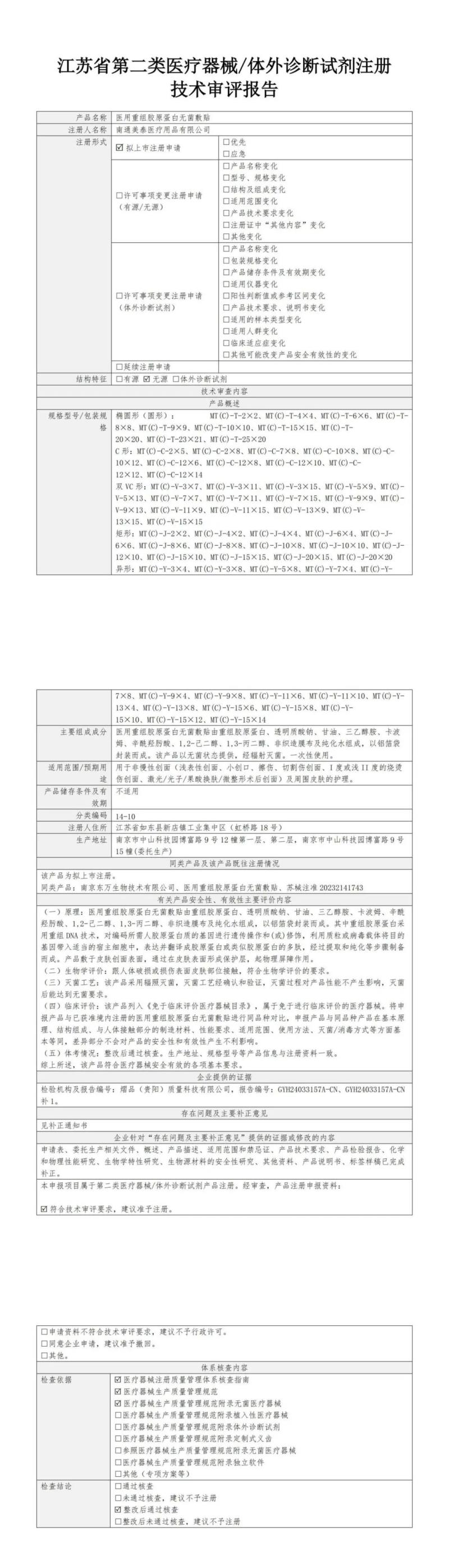 5月12日,江蘇省藥監(jiān)局公布了2025年4月批準(zhǔn)注冊的水性聚氨酯避孕套、醫(yī)用透明質(zhì)酸鈉液體敷料、醫(yī)用重組膠原蛋白液體敷料、低頻治療儀、中頻治療儀、足底壓力步態(tài)評估系統(tǒng)、視頻可視喉鏡、超短波治療儀、增材制造肺部穿刺導(dǎo)板等224個醫(yī)療器械產(chǎn)品目錄,同時隨附了所有產(chǎn)品的技術(shù)審評報告,我們其中“醫(yī)用重組膠原蛋白無菌敷貼”[預(yù)期用途:用于非慢性創(chuàng)面(淺表性創(chuàng)面、小創(chuàng)口、擦傷、切割傷創(chuàng)面、Ⅰ度或淺Ⅱ度的燒燙傷創(chuàng)面、激光/光子/果酸換膚/微整形術(shù)后創(chuàng)面)及周圍皮膚的護理]的技術(shù)審評報告以圖片形式轉(zhuǎn)載如下:
