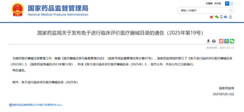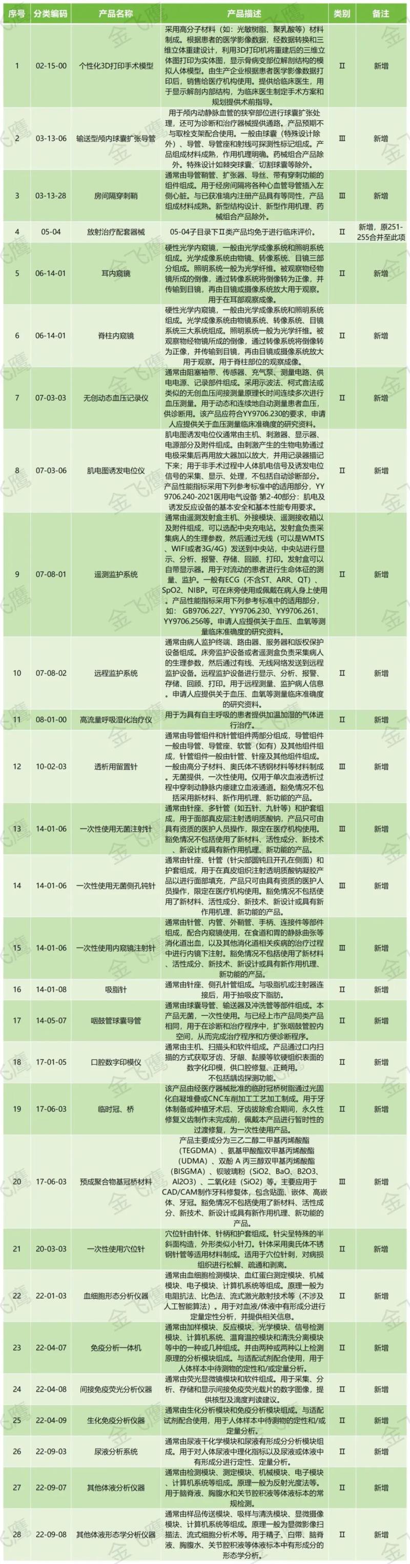 5月13日,國家藥監(jiān)局官網發(fā)布《免于進行臨床評價醫(yī)療器械目錄(2025年)》(以下簡稱《目錄》),本次《目錄》中共包含1047類(2023年為1025類)產品,通過查看附件我們可以發(fā)現(xiàn),本次新增的免臨床產品包括個性化3D打印手術模型、無創(chuàng)動態(tài)血壓記錄儀、遠程監(jiān)護系統(tǒng)、一次性使用無菌注射針(用于面部真皮層注射透明質酸鈉)等。由于《目錄》全文字數(shù)較多,不便在文章中全部展示,我們僅將本次新增的免臨床評價產品匯總如下,以供相關企業(yè)參考: