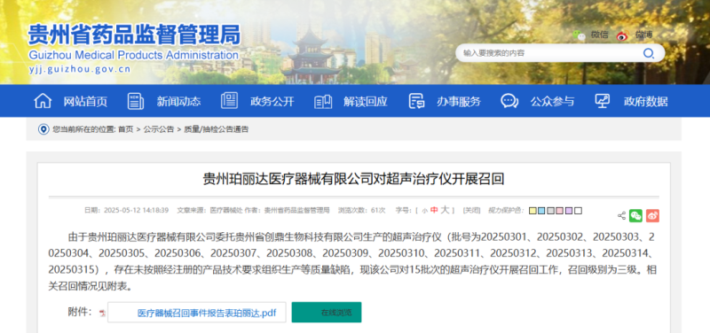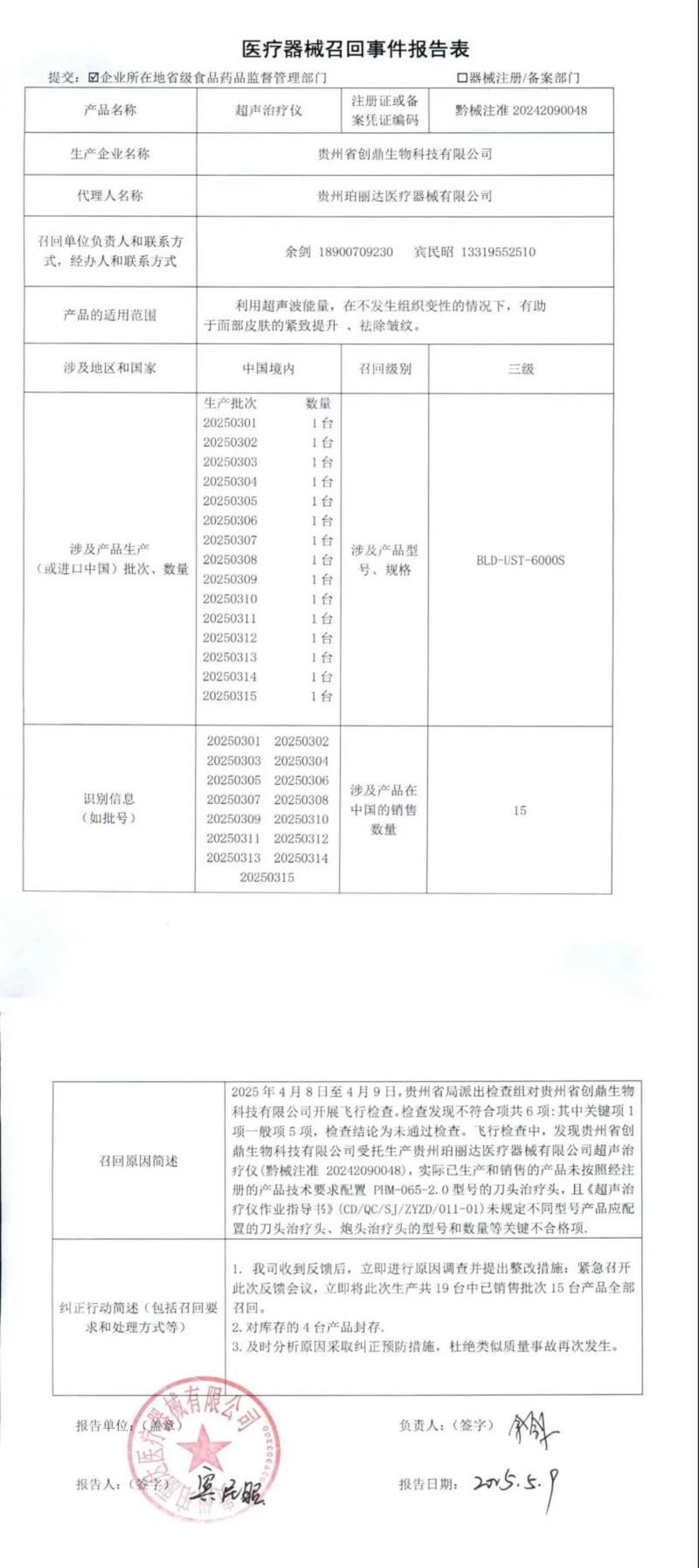 5月12日,貴州省藥監(jiān)局發(fā)布一則召回公告,其中提到,由于貴州珀麗達醫(yī)療器械有限公司委托貴州省創(chuàng)鼎生物科技有限公司生產的超聲治療儀(產品適用范圍:利用超聲波能量,在不發(fā)生組織變性的情況下,有助于面部皮膚的緊致提升、祛除皺紋),存在未按照經注冊的產品技術要求組織生產等質量缺陷,現(xiàn)該公司對15批次的超聲治療儀開展召回工作,召回級別為三級。具體召回情況如下: