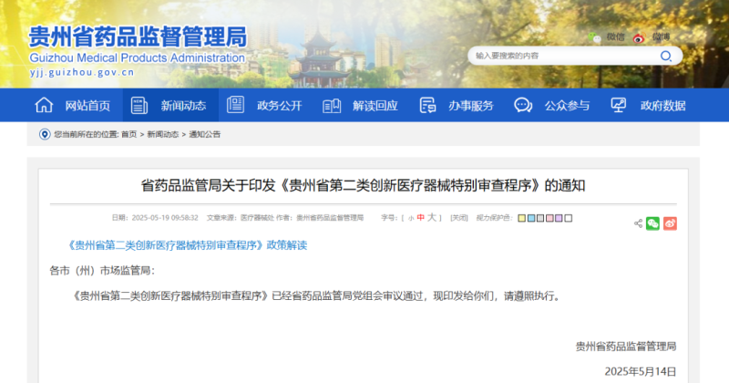 5月19日,貴州省藥監(jiān)局發(fā)布《貴州省第二類創(chuàng)新醫(yī)療器械特別審查程序》(以下簡稱《程序》),其中提到,符合以下條件的,申請人可以向省局申請第二類創(chuàng)新醫(yī)療器械特別審查: