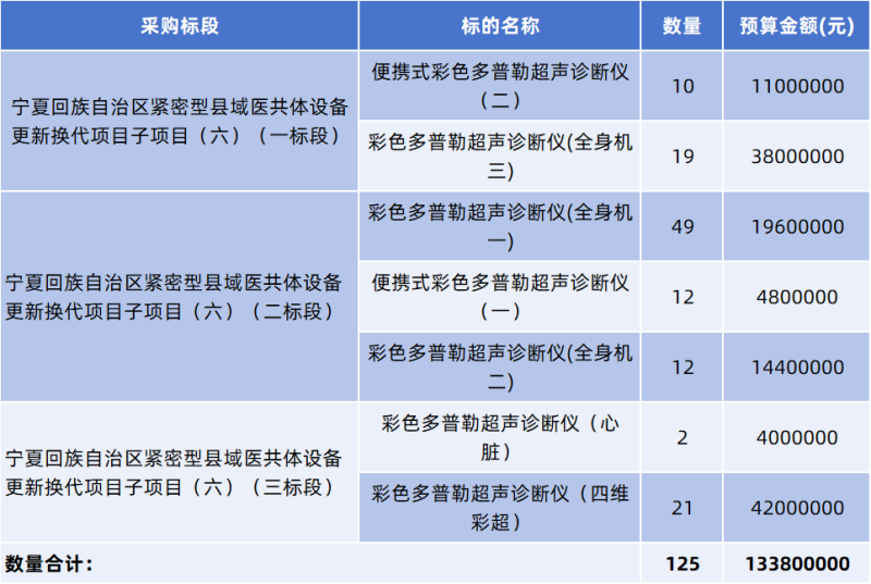 據(jù)了解,本次采購項目分為三個標(biāo)段,總預(yù)算達(dá) 1.338 億元,涉及 125 臺彩色多普勒超聲診斷儀,涵蓋便攜式、全身機(jī)、心臟以及四維彩超。