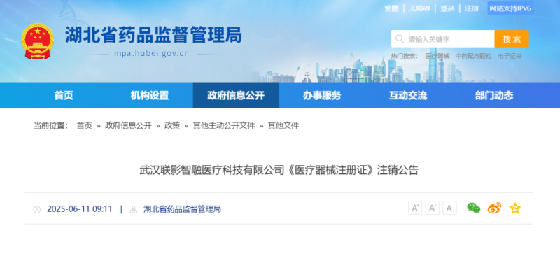 6月11日,湖北省藥監(jiān)局發(fā)布三則《醫(yī)療器械注冊(cè)證》注銷(xiāo)公告,我們通過(guò)查看公告內(nèi)容發(fā)現(xiàn),被注銷(xiāo)的注冊(cè)證均來(lái)自同一家公司——武漢聯(lián)影智融醫(yī)療科技有限公司,產(chǎn)品包括醫(yī)用電子體溫計(jì)及骨外固定系統(tǒng),以下為具體明細(xì):
