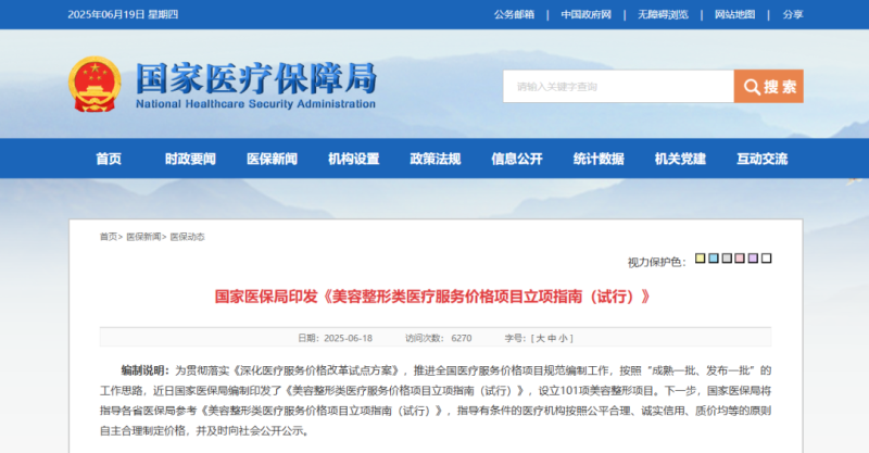 6月18日,國家醫(yī)保局印發(fā)了《美容整形類醫(yī)療服務價格項目立項指南(試行)》(以下簡稱《指南》),共規(guī)定了101項美容整形項目的服務價格相關內容,包括價格構成、計價單位等,如光/激光美容治療費的計價單位為光斑,射頻、超聲、微針等美容治療費的計價單位均為平方厘米……