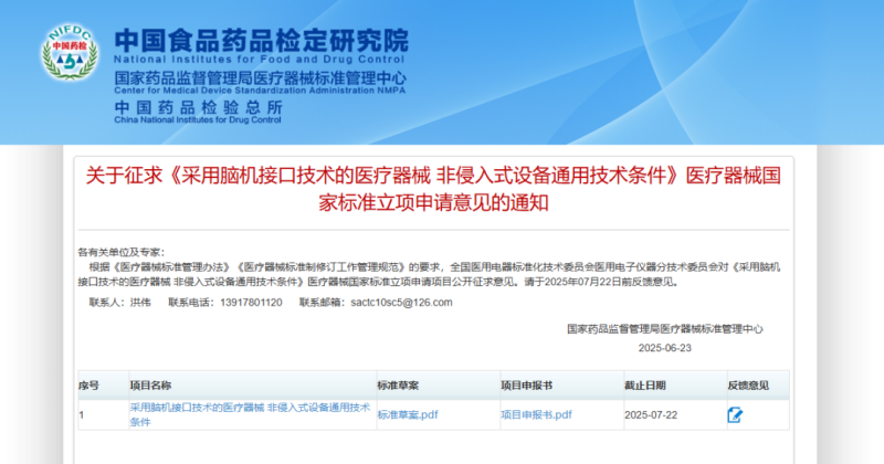 6月23日,國(guó)家藥監(jiān)局醫(yī)療器械標(biāo)管中心發(fā)布《采用腦機(jī)接口技術(shù)的醫(yī)療器械 非侵入式設(shè)備通用技術(shù)條件》醫(yī)療器械國(guó)家標(biāo)準(zhǔn)立項(xiàng)申請(qǐng),同時(shí)隨附了標(biāo)準(zhǔn)草案,并向社會(huì)公開征求意見。