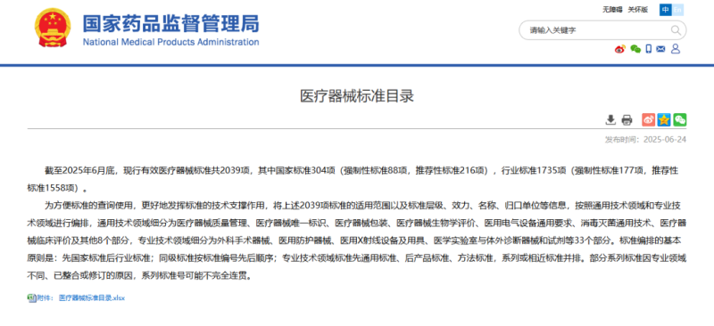 近日,國家藥監(jiān)局發(fā)布《醫(yī)療器械標(biāo)準(zhǔn)目錄》,其中提到,截至2025年6月24日,現(xiàn)行有效醫(yī)療器械標(biāo)準(zhǔn)共2039項,其中國家標(biāo)準(zhǔn)304項(強(qiáng)制性標(biāo)準(zhǔn)88項,推薦性標(biāo)準(zhǔn)216項),行業(yè)標(biāo)準(zhǔn)1735項(強(qiáng)制性標(biāo)準(zhǔn)177項,推薦性標(biāo)準(zhǔn)1558項)。