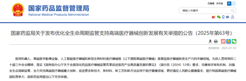 7月3日,國家藥監(jiān)局發(fā)布《關(guān)于發(fā)布優(yōu)化全生命周期監(jiān)管支持高端醫(yī)療器械創(chuàng)新發(fā)展有關(guān)舉措的公告》(以下簡稱《公告》),針對醫(yī)用機(jī)器人、高端醫(yī)學(xué)影像設(shè)備、人工智能醫(yī)療器械和新型生物材料醫(yī)療器械等(以下簡稱高端醫(yī)療器械),提出優(yōu)化特殊審批程序、完善分類和命名規(guī)則、持續(xù)健全標(biāo)準(zhǔn)體系等十方面支持舉措。