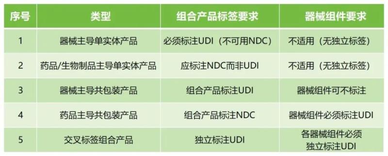 該草案提到,如21 CFR第3部分所述,組合產(chǎn)品由兩種或兩種以上不同類型的產(chǎn)品組成(即藥物、器械和/或生物制品的組合)。在組合產(chǎn)品中所包含的每種藥物、器械和生物制品都被稱為該組合產(chǎn)品的組成部分。一般包括單一實(shí)體組合產(chǎn)品、共包裝組合產(chǎn)品及交叉標(biāo)簽組合產(chǎn)品等,相應(yīng)的UDI要求如下: