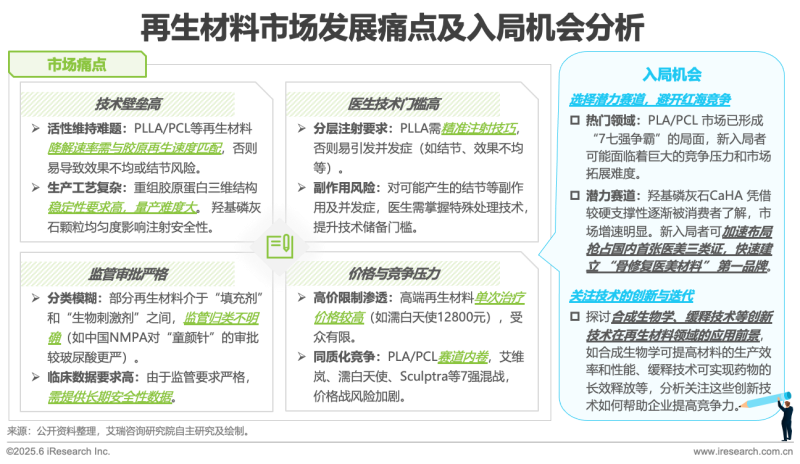 再生材料市場正面臨著技術(shù)壁壘高、醫(yī)生技術(shù)門檻高、監(jiān)管審批嚴(yán)格以及價格與競爭壓力大的多重挑戰(zhàn)。然而,市場痛點(diǎn)背后也蘊(yùn)藏著入局機(jī)會。新入局者可選擇潛力賽道,避開紅海競爭,如羥基磷灰石CaHA憑借其較硬支撐性逐漸被消費(fèi)者了解,市場增長迅速,新入局者可加速布局,搶占國內(nèi)尚未有三類證的先機(jī),快速建立品牌優(yōu)勢。同時,要關(guān)注技術(shù)的創(chuàng)新與迭代,比如合成生物學(xué)可提高材料的生產(chǎn)效率和性能,緩釋技術(shù)可實(shí)現(xiàn)藥物的長效釋放等,深入分析這些創(chuàng)新技術(shù)在再生材料領(lǐng)域的應(yīng)用前景,助力企業(yè)提高競爭力,從而在再生材料市場中尋得發(fā)展新路徑。