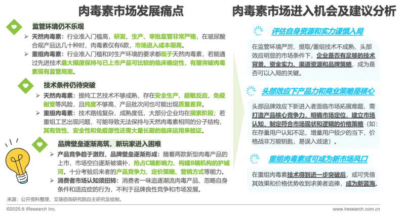 雖然肉毒素市場開始走向白熱化競爭,且我國肉毒素滲透率遠(yuǎn)低于全球、仍有很大發(fā)展空間;但考慮到當(dāng)前的醫(yī)美人群整體增量少,老牌肉毒品牌力強(qiáng)導(dǎo)致市場空間有限,監(jiān)管環(huán)境不容樂觀,技術(shù)條件不夠成熟等市場條件;不管是企業(yè)還是資本,投資肉毒素的“投入產(chǎn)出比”都是最核心的問題。因此,企業(yè)需評估自身資源和實(shí)力謹(jǐn)慎入局;在頭部效應(yīng)的壁壘下,產(chǎn)品力強(qiáng)、渠道資源力強(qiáng)、市場定位明確、價格策略合適的產(chǎn)品才能獲得脫穎而出的機(jī)會。未來,隨著新產(chǎn)品的相繼涌出、低成本的重組技術(shù)的發(fā)展,市場競爭將愈演愈烈,肉毒素企業(yè)可能需要做好打“價格戰(zhàn)”的準(zhǔn)備,或去海外尋找一些新的合作機(jī)會。