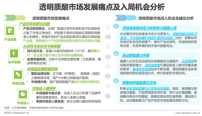 中國透明質(zhì)酸行業(yè)近年來經(jīng)歷了顯著的增長,這一趨勢得益于市場需求的不斷擴(kuò)大以及應(yīng)用領(lǐng)域的持續(xù)拓展。然而,在這一高速增長的背后,行業(yè)也面臨著產(chǎn)品同質(zhì)化、長效性與安全性平衡難題、價格戰(zhàn)和市場進(jìn)入障礙等痛點(diǎn)。盡管如此,行業(yè)的發(fā)展并非沒有機(jī)遇。技術(shù)創(chuàng)新是實(shí)現(xiàn)產(chǎn)品差異化的關(guān)鍵,企業(yè)可以通過研發(fā)新技術(shù)、改進(jìn)生產(chǎn)工藝等方式,提升產(chǎn)品的競爭力。企業(yè)若能評估自身技術(shù)實(shí)力實(shí)現(xiàn)差異化創(chuàng)新,關(guān)注私密美容等新型潛力市場,探索與膠原蛋白等材料復(fù)配的潛力方向,也能在競爭中尋得入局發(fā)展的機(jī)會。