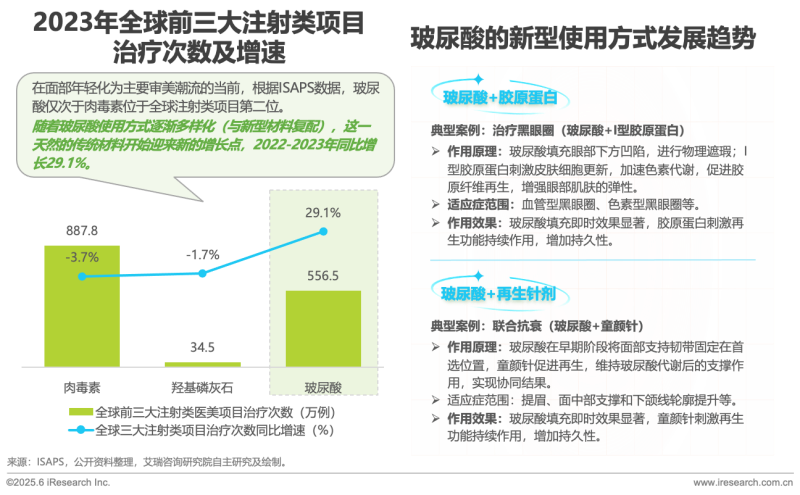 隨著醫(yī)美上游材料的多樣化,玻尿酸作為“頂流”的地位是否會受到?jīng)_擊一直是行業(yè)內(nèi)熱議的話題。根據(jù)ISAPS數(shù)據(jù),2023年全球注射類項(xiàng)目排名中,玻尿酸僅次于肉毒素位居第二。但隨著玻尿酸的復(fù)配方式多樣化、聯(lián)合治療手段越來越成熟,其應(yīng)用邊界被不斷拓寬,2022-2023年增速遠(yuǎn)超肉毒素達(dá)29.1%,似乎迎來了它的“第二增長曲線”。