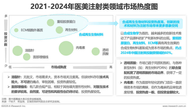 技術(shù)的進(jìn)步推動著上游原料的擴(kuò)產(chǎn)和材料的多樣化、安全化和同源化,ECM等各種新型材料不斷出現(xiàn),以重組膠原蛋白、再生材料等為首的合成再生生物材料成為醫(yī)美機(jī)構(gòu)投資重點(diǎn)。根據(jù)IT桔子數(shù)據(jù),2024年包括泰美瑞、圣至潤和等在內(nèi)的再生生物材料領(lǐng)域的企業(yè)紛紛融資,投資事件約占總注射類材料投資的60%。按照審批情況來看,根據(jù)藥監(jiān)局不完全統(tǒng)計(jì),截止到2024年11月一共有15款針劑通過審批,以玻尿酸類為主,還有幾款聚左旋乳酸、聚己內(nèi)酯和肉毒素類產(chǎn)品。雖然玻尿酸領(lǐng)域近年來投資熱度一般,但其仍為注射類市場的“老字號產(chǎn)品”和“熱門賽道”,與各種新型材料的聯(lián)合復(fù)配也將進(jìn)一步豐富產(chǎn)品矩陣,拓寬注射類市場邊界。