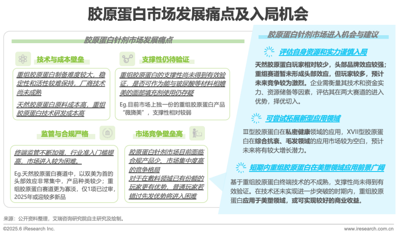 膠原蛋白作為人體內(nèi)天然存在的成分,與玻尿酸一樣,對醫(yī)療美容存在著重大的意義。目前,膠原蛋白二類械市場競爭已十分火熱,但鑒于終端技術(shù)的限制,醫(yī)美針劑等三類械市場仍相對空白。隨著2025年三類械批證的增加,膠原蛋白針劑市場競爭將逐漸激烈,市場格局有望產(chǎn)生新的變化。由于終端技術(shù)還不夠成熟,成本困境仍未突破,相較于玻尿酸等市場,膠原蛋白針劑在醫(yī)美領(lǐng)域的滲透率相對較低;但鑒于其天然性、與人體的適配性,在技術(shù)突破之前,或?qū)⒃诿浪茴I(lǐng)域侵占較大市場份額。