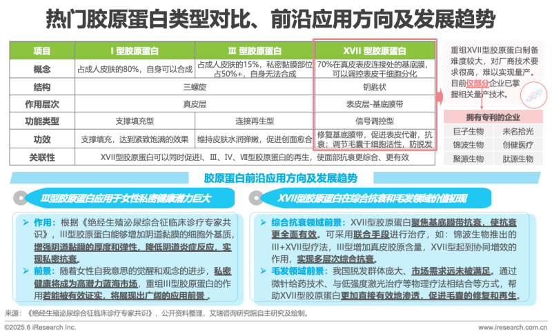 膠原蛋白按照結(jié)構(gòu)和功能可以劃分為28種類型(包括I、Ⅱ、Ⅲ、Ⅳ、Ⅴ、Ⅵ、Ⅹ、XVII…),每種類型的膠原蛋白在人體中扮演著不同的角色。近年來,醫(yī)美行業(yè)應(yīng)用最為廣泛的是I型和Ⅲ型膠原蛋白,起到面部支撐填充及皮膚水潤彈嫩的效果,是抗衰界的潮流產(chǎn)品。隨著對這兩種膠原蛋白適應(yīng)癥的不斷開拓、專業(yè)玩家技術(shù)的成熟及下游消費(fèi)者需求的進(jìn)階,以XVII型為代表的更多類型的膠原蛋白及其多元功效被不斷發(fā)掘,終端應(yīng)用場景不斷拓展,產(chǎn)品矩陣日漸豐富。