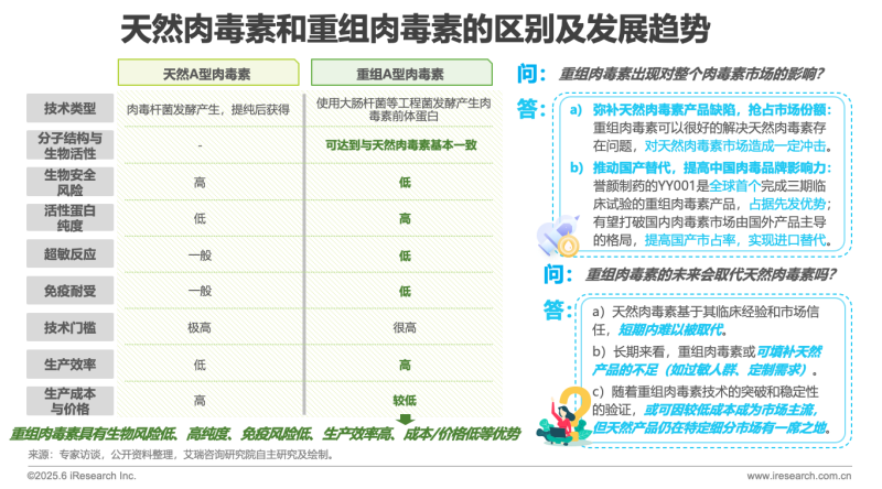 天然肉毒素是從肉毒桿菌培養(yǎng)液中提取的神經(jīng)毒素,含有毒素蛋白及輔助蛋白,臨床應(yīng)用歷史悠久,但可能存在批次差異和雜質(zhì)風(fēng)險。重組肉毒素通過基因工程生產(chǎn),僅含純化毒素蛋白,純度高、穩(wěn)定性強(qiáng),并可定制化調(diào)整效力或持久性。未來,重組肉毒素有望憑借安全性和可設(shè)計(jì)性逐步滲透醫(yī)美市場,但短期內(nèi)天然產(chǎn)品仍占主導(dǎo)。長期來看,兩者可能共存——重組產(chǎn)品側(cè)重高純度、個性化需求,而天然產(chǎn)品依賴品牌信任和成熟應(yīng)用。技術(shù)進(jìn)步和成本優(yōu)化將是重組肉毒素能否顛覆市場的關(guān)鍵。