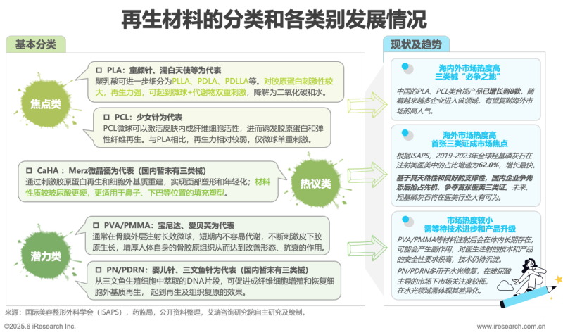 醫(yī)美再生注射類產(chǎn)品通常以微球的形式存在,通過刺激人體自身膠原蛋白的再生,起到填充凹陷、緊致肌膚、美容塑型的作用。醫(yī)美再生材料種類較多,近兩年市場焦點(diǎn)基本集中在聚乳酸(PLA)和聚己內(nèi)酯(PCL)兩大類別,以童顏針、少女針為代表的一系列再生針劑賦予醫(yī)美市場更豐富的品類和更高的增速,也成為各大廠商進(jìn)軍再生領(lǐng)域的“必爭之地”。其次,羥基磷灰石(CaHA)作為人體中天然存在的一種材料廣泛用于骨修復(fù),它較硬的支撐性或可推動其未來在隆鼻、墊下巴等填充領(lǐng)域獲得較大市場份額。