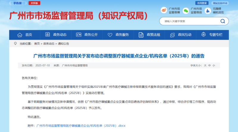 7月10日,廣州市市場監(jiān)督管理局發(fā)布了動態(tài)調(diào)整后的醫(yī)療器械重點企業(yè)/機構(gòu)名單(2025年),共有廣州邁普再生醫(yī)學(xué)科技股份有限公司、廣州萬孚生物技術(shù)股份有限公司、廣州衛(wèi)視博生物科技有限公司、廣州科萊瑞迪醫(yī)療器材股份有限公司等108家企業(yè)上榜,而根據(jù)《廣州市市場監(jiān)督管理局關(guān)于組織實施2025年度廣州市醫(yī)療器械注冊申報前置技術(shù)服務(wù)項目的通知》,上榜企業(yè)可享受醫(yī)療器械注冊申報前置技術(shù)服務(wù),具體如下: