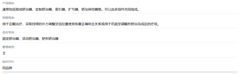 我們通過查看本次獲證產品的“結構及組成”可以看到,此類產品“由具有醫(yī)療器械注冊證的牙科膜片經壓制成型后打磨、拋光而成?!币虼耍?span textstyle="" style="-webkit-tap-highlight-color: transparent; margin: 0px; padding: 0px; outline: 0px; max-width: 100%; box-sizing: border-box !important; overflow-wrap: break-word !important; font-weight: bold;">牙膠片/牙科膜片是正畸矯治器最為關鍵的一項原材料,可以外購,也可以企業(yè)自己生產,但前提是要有注冊證(同樣是Ⅱ類產品,分類編碼17-10-05)。