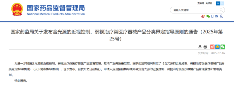 7月16日,國家藥監(jiān)局發(fā)布《含光源的近視控制、弱視治療類醫(yī)療器械產(chǎn)品分類界定指導(dǎo)原則》(以下簡稱《指導(dǎo)原則》),并宣布自發(fā)布之日起施行。
