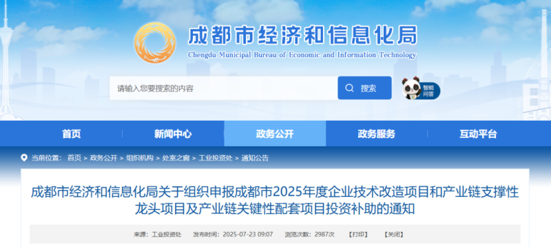 7月23日,成都市經(jīng)濟和信息化局發(fā)布《關(guān)于組織申報成都市2025年度企業(yè)技術(shù)改造項目和產(chǎn)業(yè)鏈支撐性龍頭項目及產(chǎn)業(yè)鏈關(guān)鍵性配套項目投資補助的通知》(以下簡稱《通知》),其中提到,對符合條件的企業(yè),給予最高1000萬元補助。《通知》具體內(nèi)容如下: