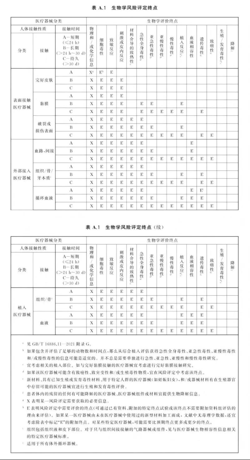 按照上述接觸性質(zhì)和接觸時(shí)間2個(gè)分類(lèi)原則確定了醫(yī)療器械類(lèi)別之后,再根據(jù)標(biāo)準(zhǔn)GB/T 16886.1-2022的附錄A表A.1給醫(yī)療器械找出相對(duì)應(yīng)的生物相容性檢驗(yàn)項(xiàng)目。