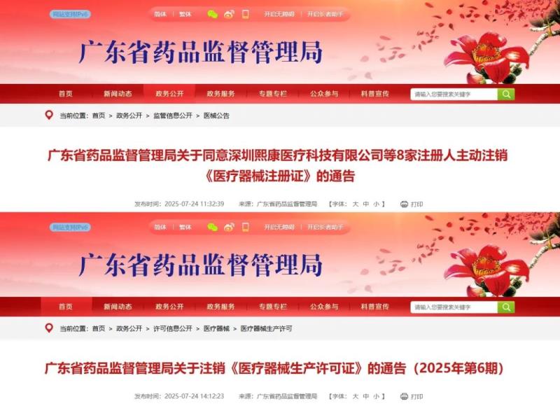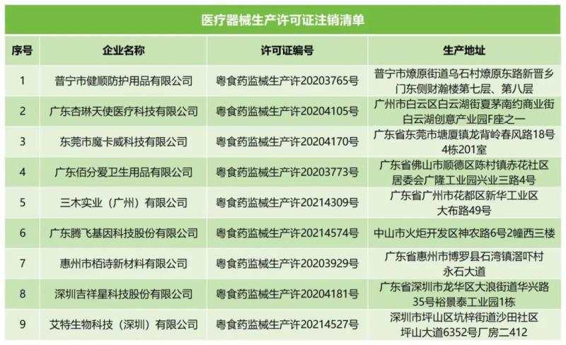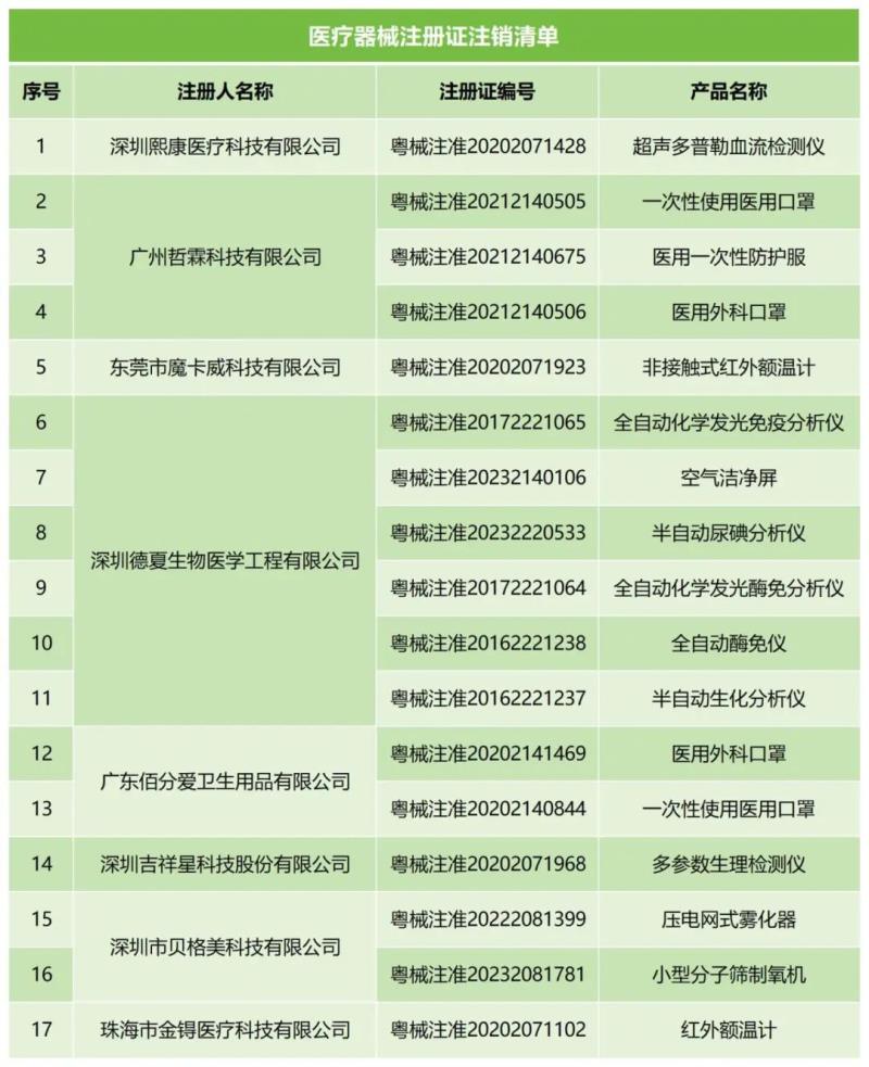 近日,廣東省藥監(jiān)局發(fā)布兩則注銷通告,通告顯示,根據(jù)企業(yè)申請,該局已注銷深圳熙康醫(yī)療科技有限公司、深圳德夏生物醫(yī)學(xué)工程有限公司等8家注冊人持有的17張《醫(yī)療器械注冊證》,同時注銷了廣東佰分愛衛(wèi)生用品有限公司、深圳吉祥星科技股份有限公司等9家企業(yè)的《醫(yī)療器械生產(chǎn)許可證》,具體明細如下: