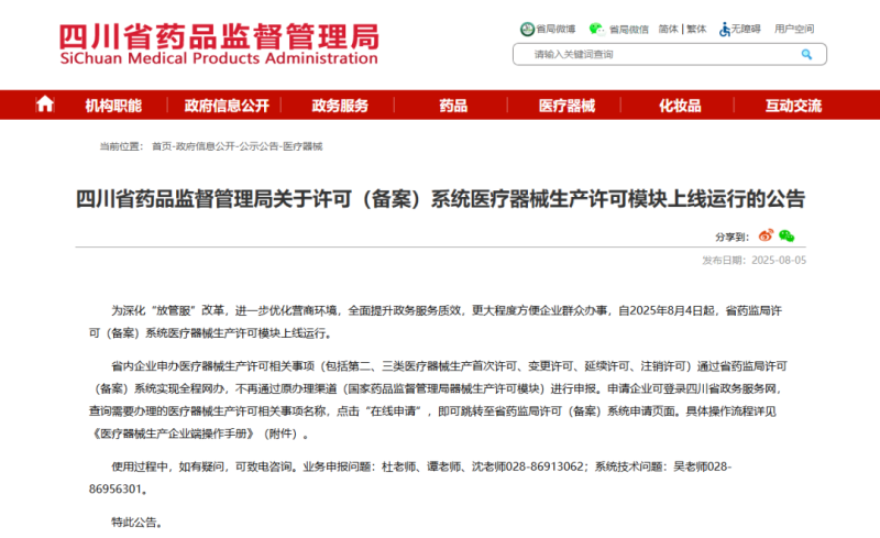 8月4日,四川省藥監(jiān)局發(fā)布《關于許可(備案)系統(tǒng)醫(yī)療器械生產許可模塊上線運行的公告》(以下簡稱《公告》),其中提到,自2025年8月4日起,省藥監(jiān)局許可(備案)系統(tǒng)醫(yī)療器械生產許可模塊上線運行。