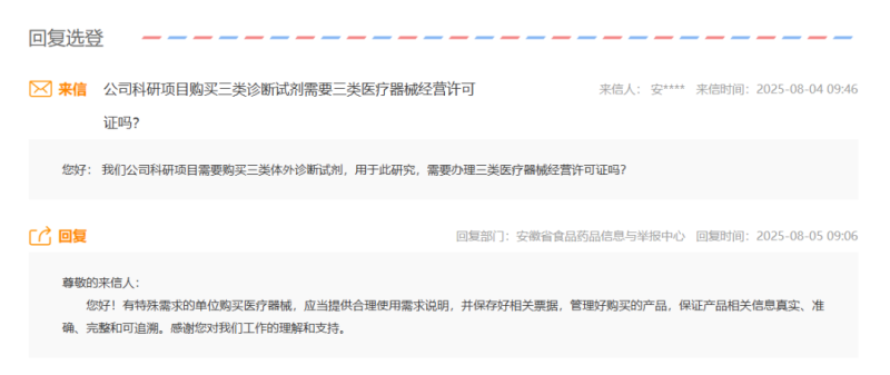 根據(jù)安徽省藥監(jiān)局的答復(fù),有特殊需求的單位購買醫(yī)療器械,應(yīng)當(dāng)提供合理使用需求說明,并保存好相關(guān)票據(jù),管理好購買的產(chǎn)品,保證產(chǎn)品相關(guān)信息真實、準(zhǔn)確、完整和可追溯。