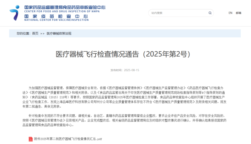 近日,國家藥監(jiān)局食品藥品審核查驗中心(以下簡稱“核查中心”)發(fā)布《醫(yī)療器械飛行檢查情況通告(2025年第2號)》,其中提到,核查中心組織開展了醫(yī)療器械生產(chǎn)企業(yè)飛行檢查工作,發(fā)現(xiàn)上海品峰醫(yī)療科技有限公司鄭州分公司、深圳生科原生物有限公司、成都永新醫(yī)療設(shè)備有限公司等16家企業(yè)存在不符合《醫(yī)療器械生產(chǎn)質(zhì)量管理規(guī)范》要求的相關(guān)問題,生產(chǎn)品種包括甲胎蛋白(AFP)測定試劑盒(化學(xué)發(fā)光法)、總前列腺特異性抗原(tPSA)測定試劑盒(化學(xué)發(fā)光法)、關(guān)節(jié)內(nèi)窺鏡、注射泵、神經(jīng)外科手術(shù)導(dǎo)航定位系統(tǒng)等。